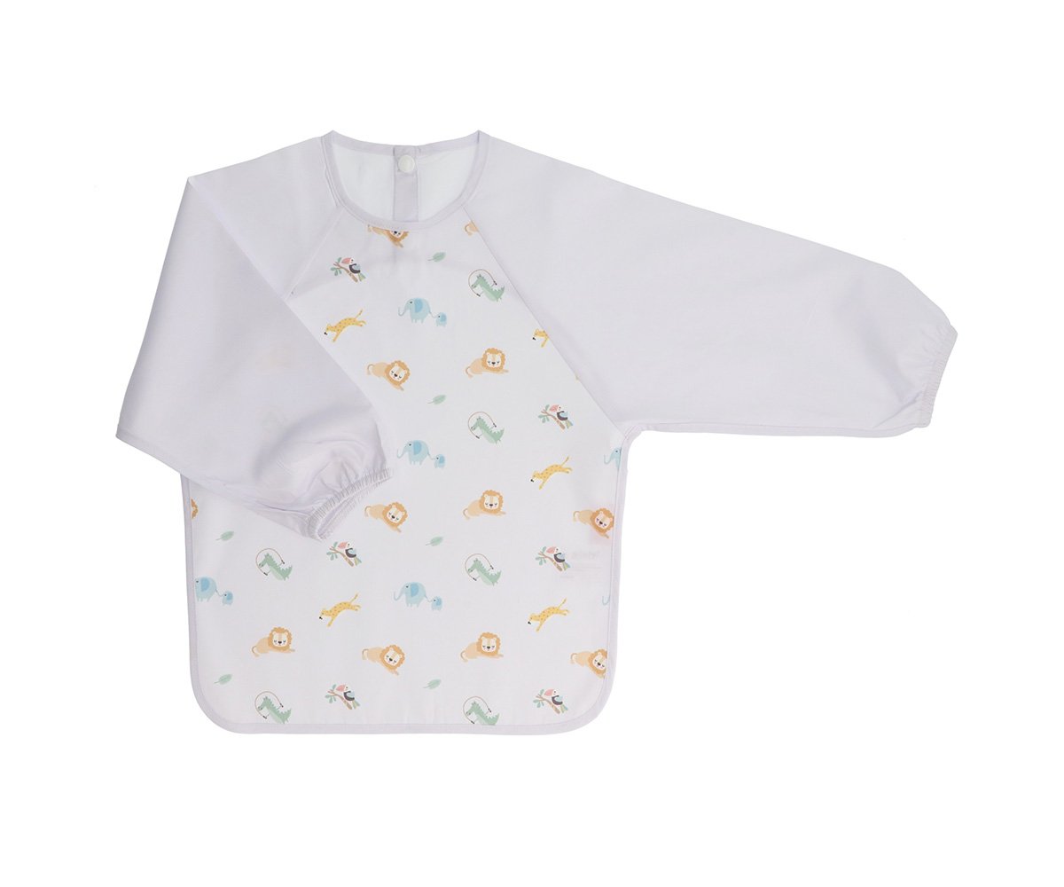 El babero con mangas de la colección Bugs de Tutete está fabricado en poliéster con acabado waterproof, una capa repelente al agua y los líquidos, lo que lo hace ideal para proteger la ropa de tu peque durante las comidas y facilitando su limpieza posterior.