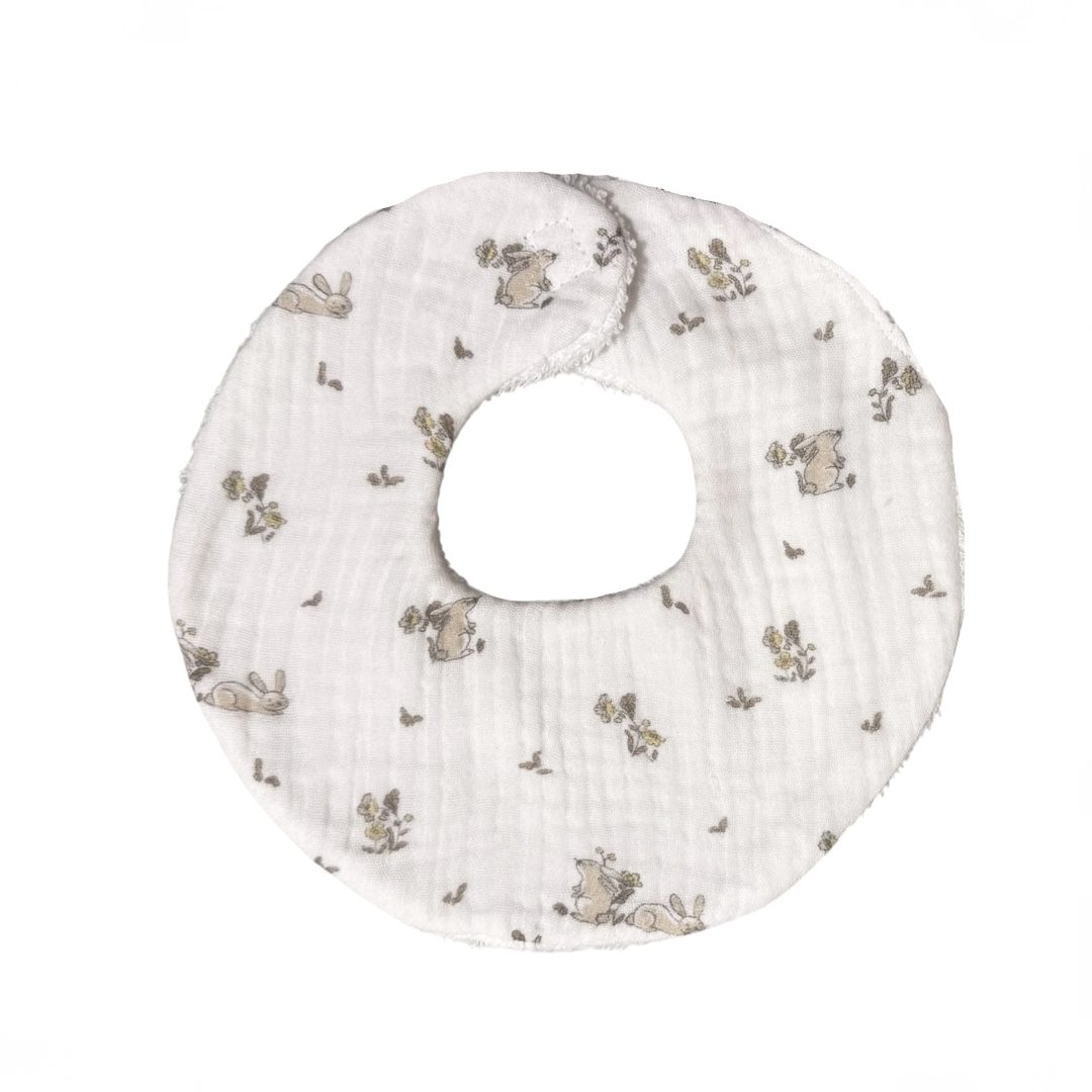 Babero frontal en tejido de algodón estampado. Reverso con toalla de rizo blanco. Cierre con Velcro.