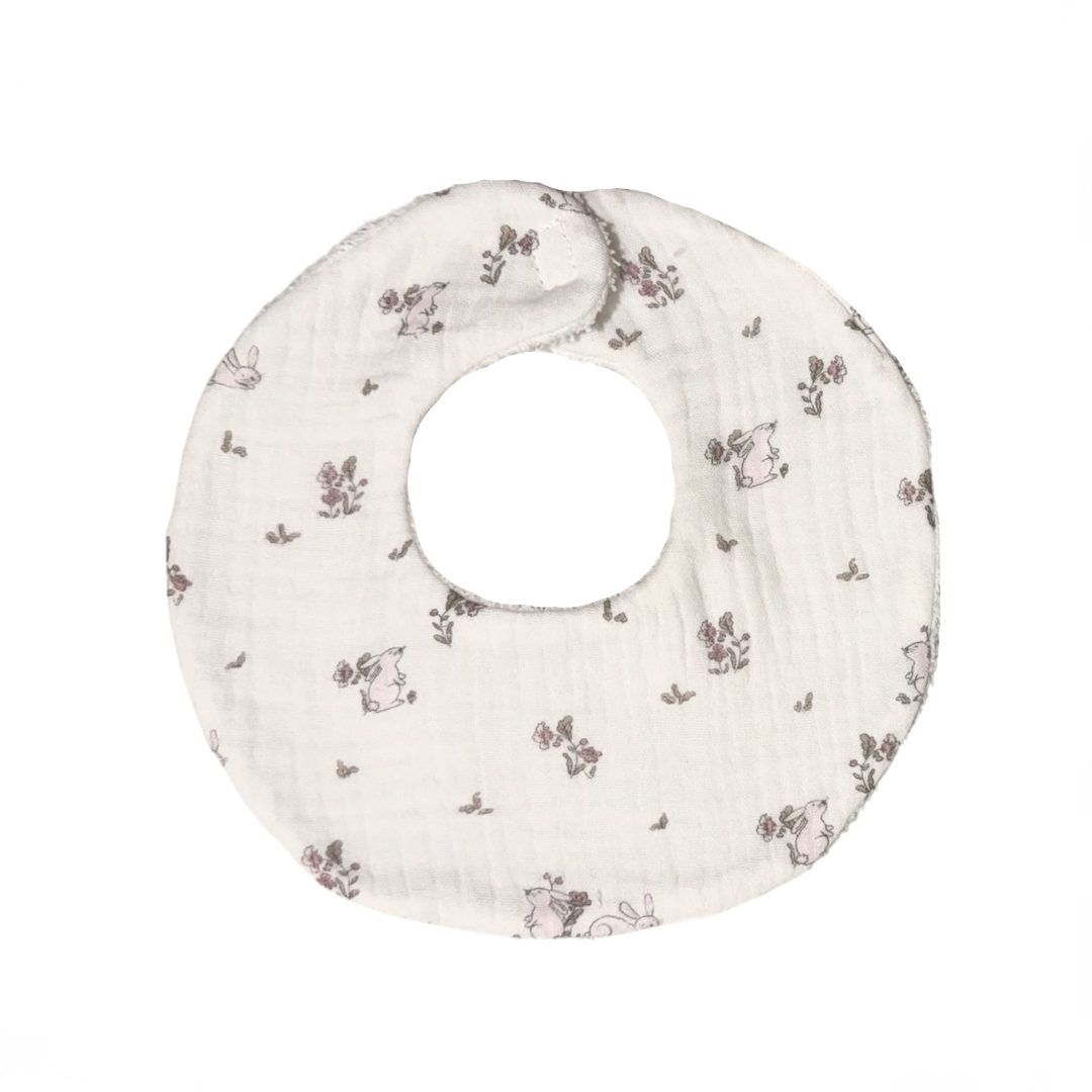 Babero frontal en tejido de algodón estampado. Reverso con toalla de rizo blanco. Cierre con Velcro.