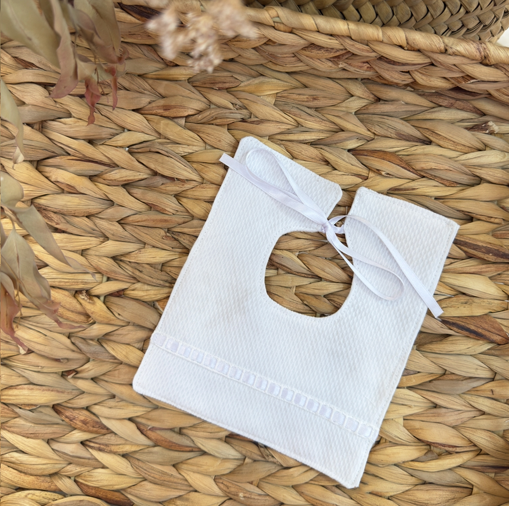 Babero practico y comodo para vuestros bebes, en pique blanco con tela de rizo impermeable por la parte de atrás.