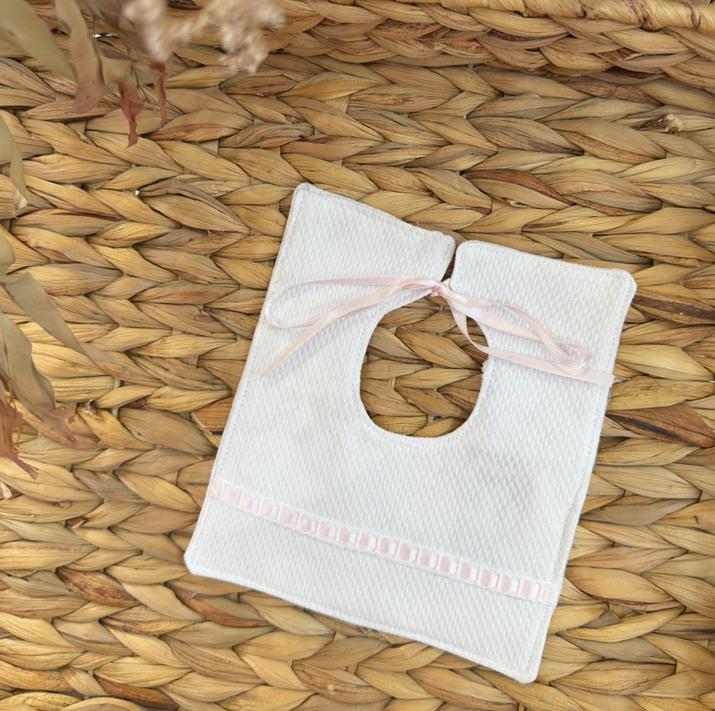 Babero practico y comodo para vuestros bebes, en pique blanco con tela de rizo impermeable por la parte de atrás.