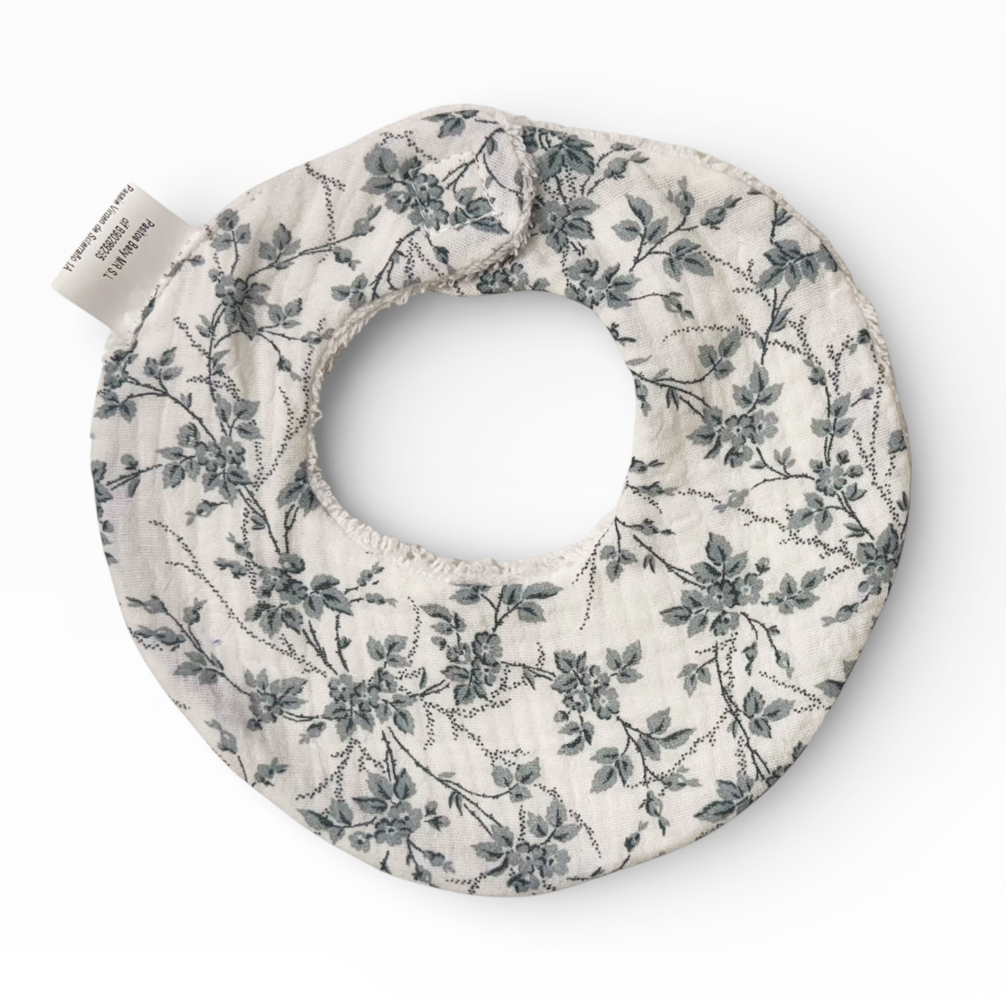 Babero frontal en tejido de algodón estampado. Reverso con toalla de rizo blanco. Cierre con Velcro.