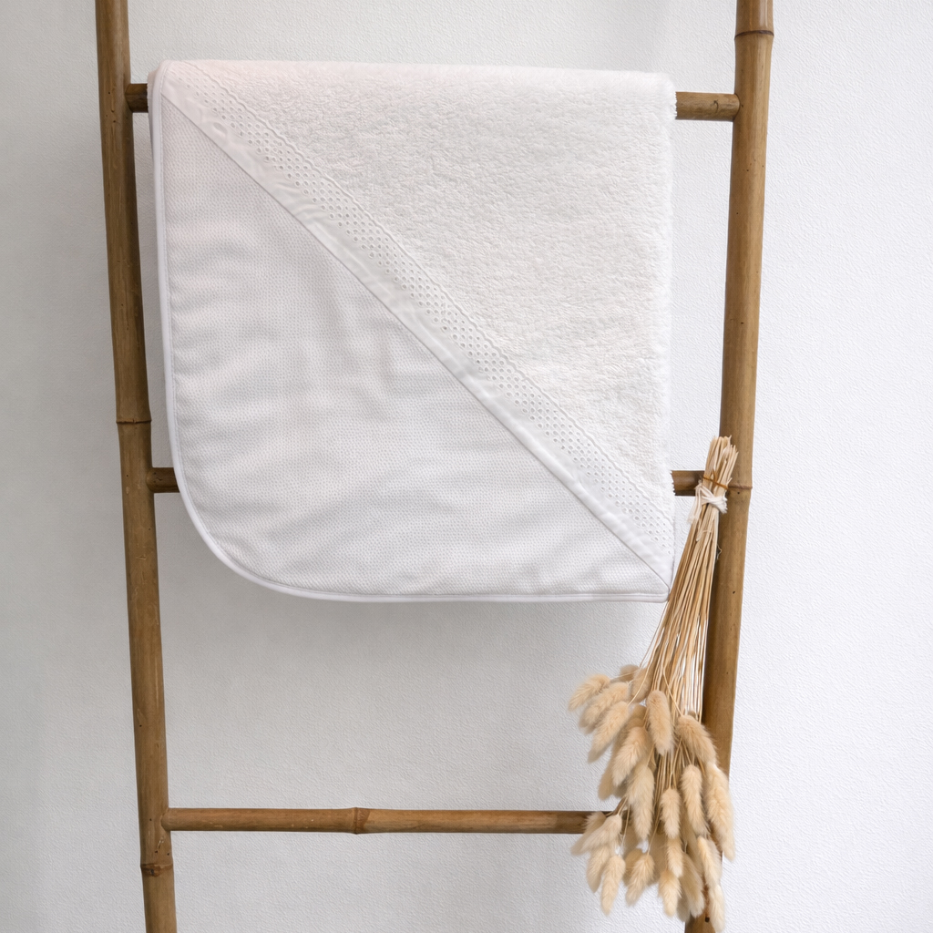 Nuestras capitas de baño son perfectas para sacar al bebé de la ducha, confeccionadas en algodón 100% son una capa clásica de toda la vida con tira bordada Ana.
