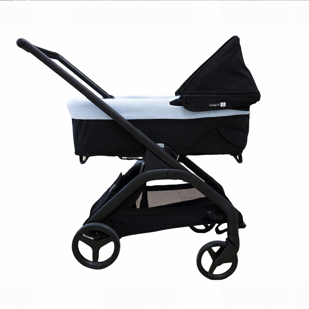 Funda realizada especialmente para el capazo de Bugaboo Dragonfly. Queda totalmente adaptada al capazo, de forma que las paredes se quedan totalmente limpias y protegen la funda original del carro.