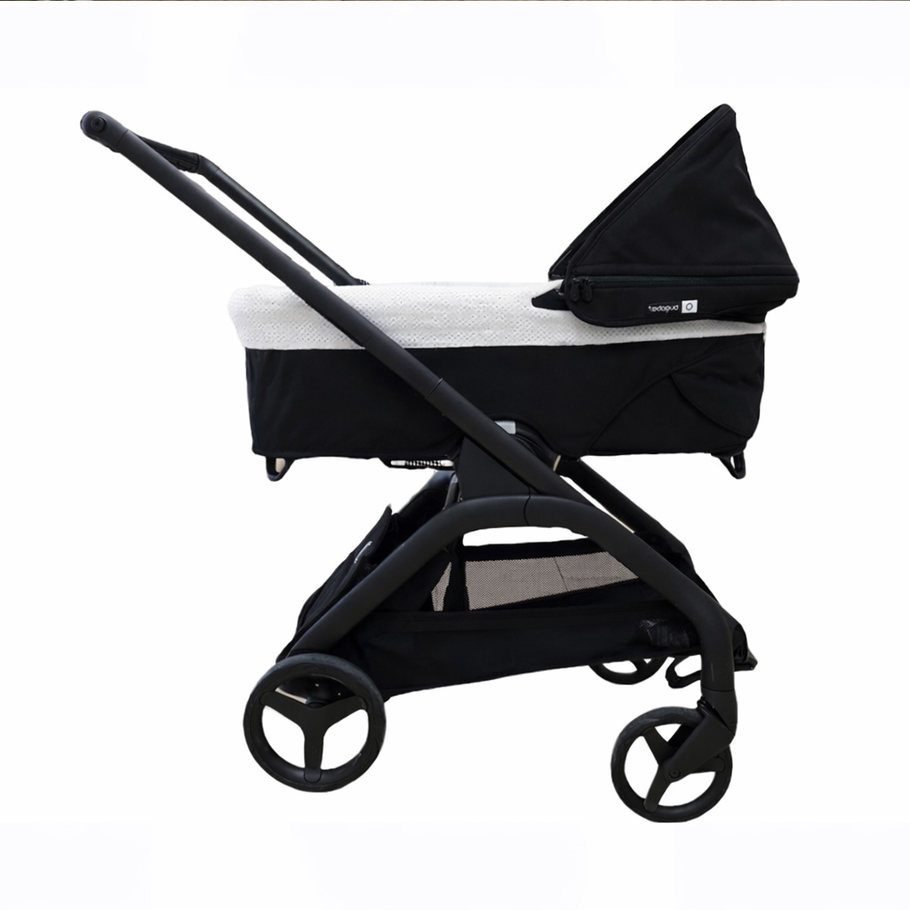 Funda realizada especialmente para el capazo de Bugaboo Dragonfly. Queda totalmente adaptada al capazo, de forma que las paredes se quedan totalmente limpias y protegen la funda original del carro.
