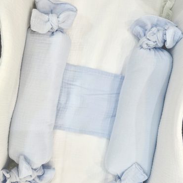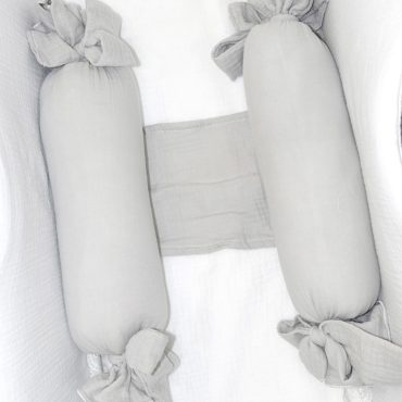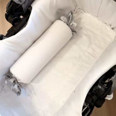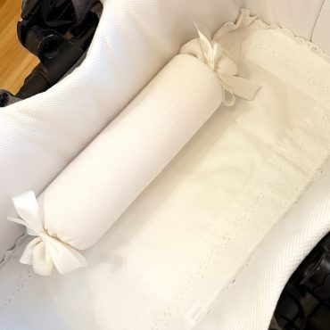 Rulo antivuelco desenfundable con práctica gomas invisible en el borde para su perfecto ajuste. Relleno de espuma sólida para el correcto posicionamiento del recién nacido en sus primeros meses.