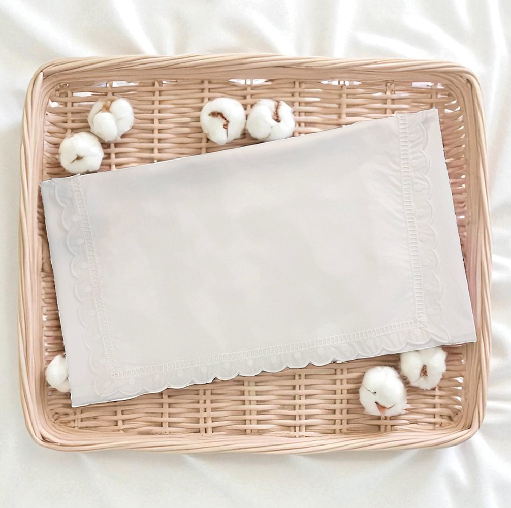 Sábanita para carrito, capazos de mimbre, minicunas etc. Fabricada en tejido de algodón 100% con certificado OEKO-TEX. El embozo lleva una tira bordada en el mismo tono.