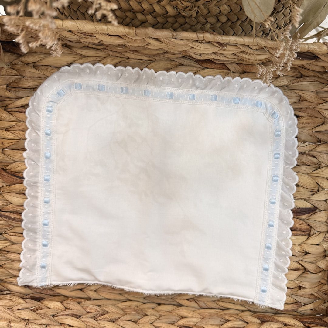 El mejor aliado para el carrito o cuna de tu bebé. Olvídate de cambiar la bajera o fregar el colchón, utiliza el salvabas de rizo blanco y tira bordada para apoyar sobre él la cabecita del bebé y utilizarlo para no manchar.